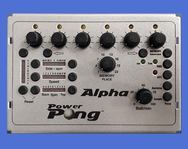The Power Pong Alpha table tennis robot is a 3-wheel head robot that shares most of its features with the Power Pong Beta, Delta and Omega. It's able to create "complex" training drills, involving a serve or return of serve, followed by a combination of balls with no spin, underspin, sidespin and topspin combinations.